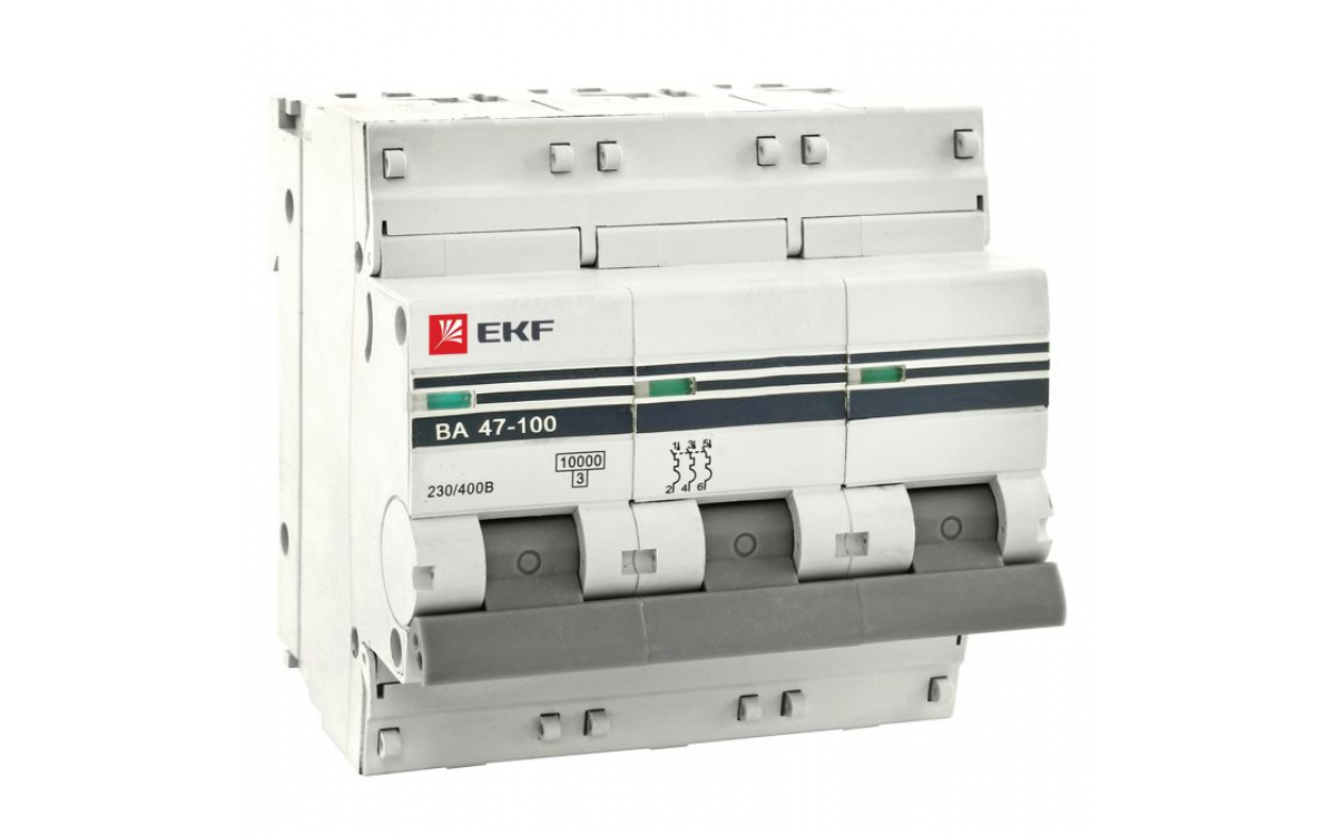 Модульные автоматические выключатели серии ВА 47-100 EKF являются механическими коммутационными аппаратами. Применяются в административных, промышленных и жилых сооружениях для проведения тока в нормальном режиме, оперативного управления участками электрических цепей, служат в качестве основного элемента системы конечного распределения и выполняют защиту установок от перегрузок, коротких замыканий и сверхтоков, обеспечивая их надежную и безопасную эксплуатацию. Автоматические выключатели серии ВА 47-100 EKF оборудованы удобной ручкой управления, обеспечивающей безотказное оперирование изделиями. На лицевой панели выключателей имеется цветовой индикатор состояния. Конструкция установочного зажима облегчает установку выключателя на DIN-рейку. Характеризуютя увеличенной наибольшей отключающей способностью не менее 10 кА - это максимально возможный ток короткого замыкания, при возникновении которого автоматический выключатель сможет отключить защищаемую им цепь и остаться при этом работоспособным.