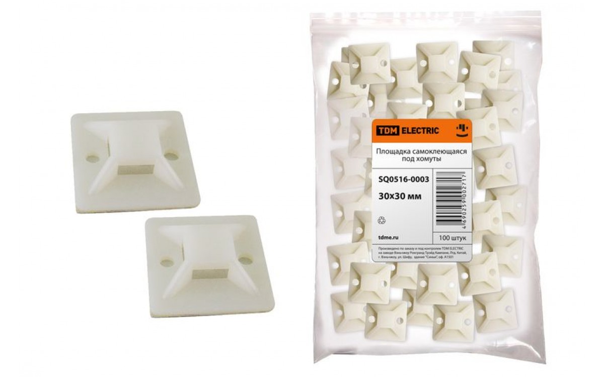 Площадка под хомуты предназначена для крепления хомутов к любой плоской поверхности с помощью самоклеющегося слоя; изготовлена из полиамида (нейлон 6.6) белого цвета, устойчивого к старению, коррозии, воздействию ультрафиолета, солей, щелочей, кислот, бензина, спирта и масел. При необходимости (например, при производстве наружных работ) площадку к поверхности можно закрепить винтом или