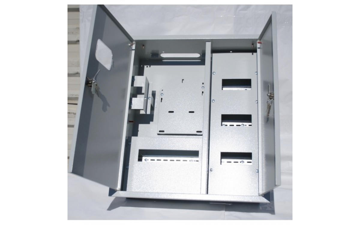Комплектация поставки щита учета ЩРУВ-3/30 : Корпус двухдверный с пластиковым окном, DIN-рейки и фальш-панель для установки соответствующего количества модульной аппаратуры, рейка и панель для установки и опломбирования вводного автомата, монтажная панель для крепления одно- или трехфазного счетчика, обмедненные шпилькизаземления двери (корпуса), замок с двумя ключами одинаковой степени секретности.