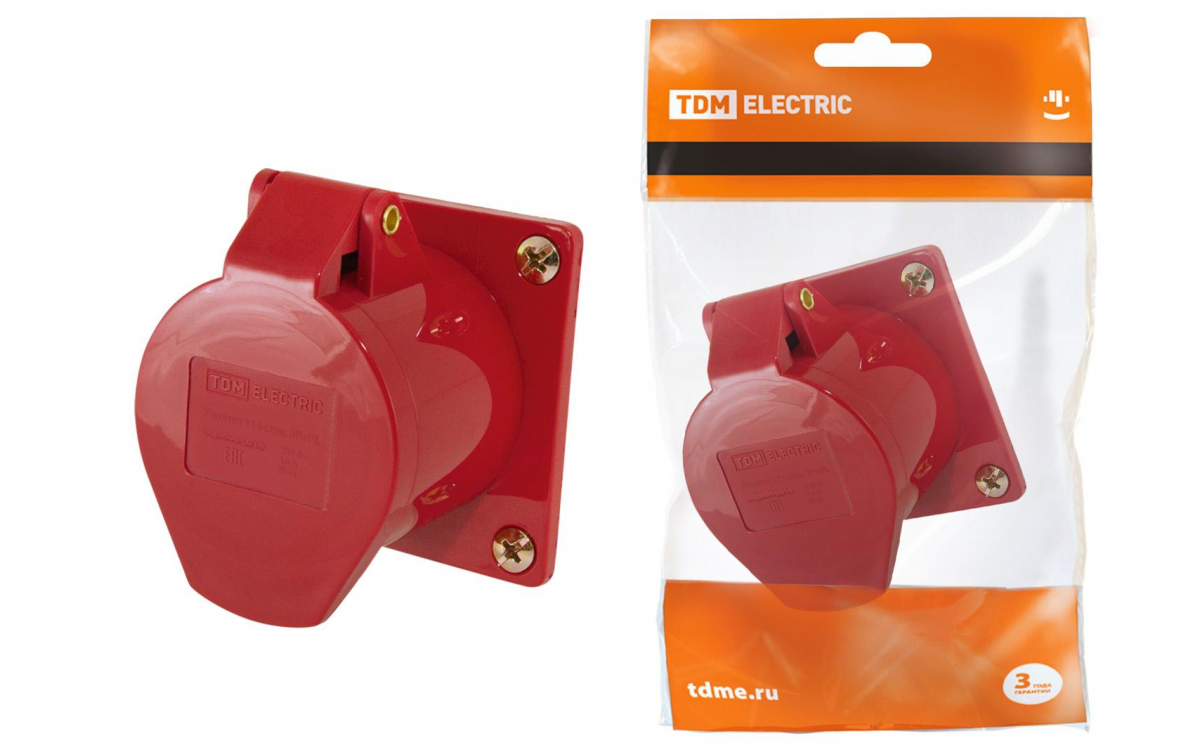 Розетка силовая (CEE) панельная фланцевая 5Р 75x75 400 В (50+60 ГЦ) КРАСНАЯ 6ч пластик IP44 TDM ELECTRIC