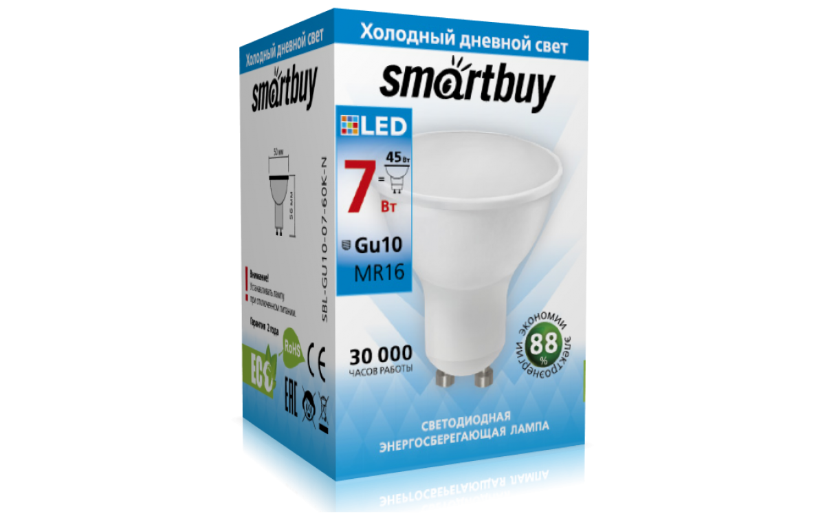 Светодиодная лампа Smartbuy SBL-GU10-07-60K-N общего или декоративного освещения, подходит для замены стандартных ламп накаливания и галогенных. Благодаря своей экономичности, длительному сроку службы и экологичности светодиодные лампы выгодно отличаются от своих предшественников. Не содержит ртуть, экологически безопасна.